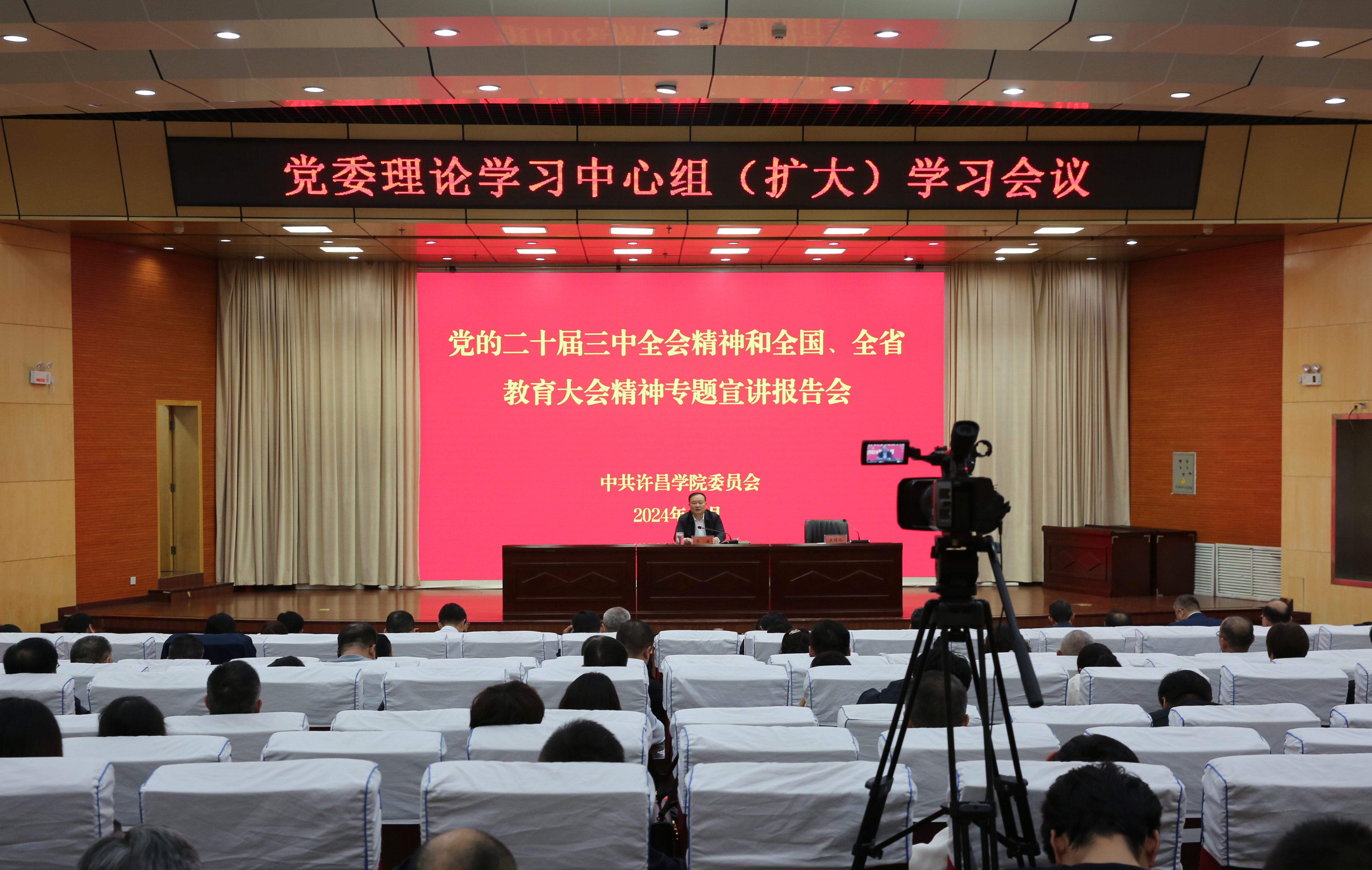 10月17日下午,校党委书记郭涛在学术报告厅为威尼斯官网师生作党的二十届三中全会精神和全国、全省教育大会精神宣讲报告。全体在校校领导、全体中层干部、党委宣讲团成员、思政课教师代表和青马班学生代表参加报告会。报告会由党委副书记、工会主席梁予昉主持。