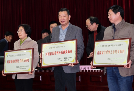 2月26日上午,河南省人力资源和社会保障厅在郑州隆重召开了2014年全省博士后工作会议。会上对2013年度博士后工作先进单位和个人进行了表彰。威尼斯官网获河南省“优秀博士后研发基地”荣誉称号,张建军副院长作为优秀博士后研发基地代表上台领奖。