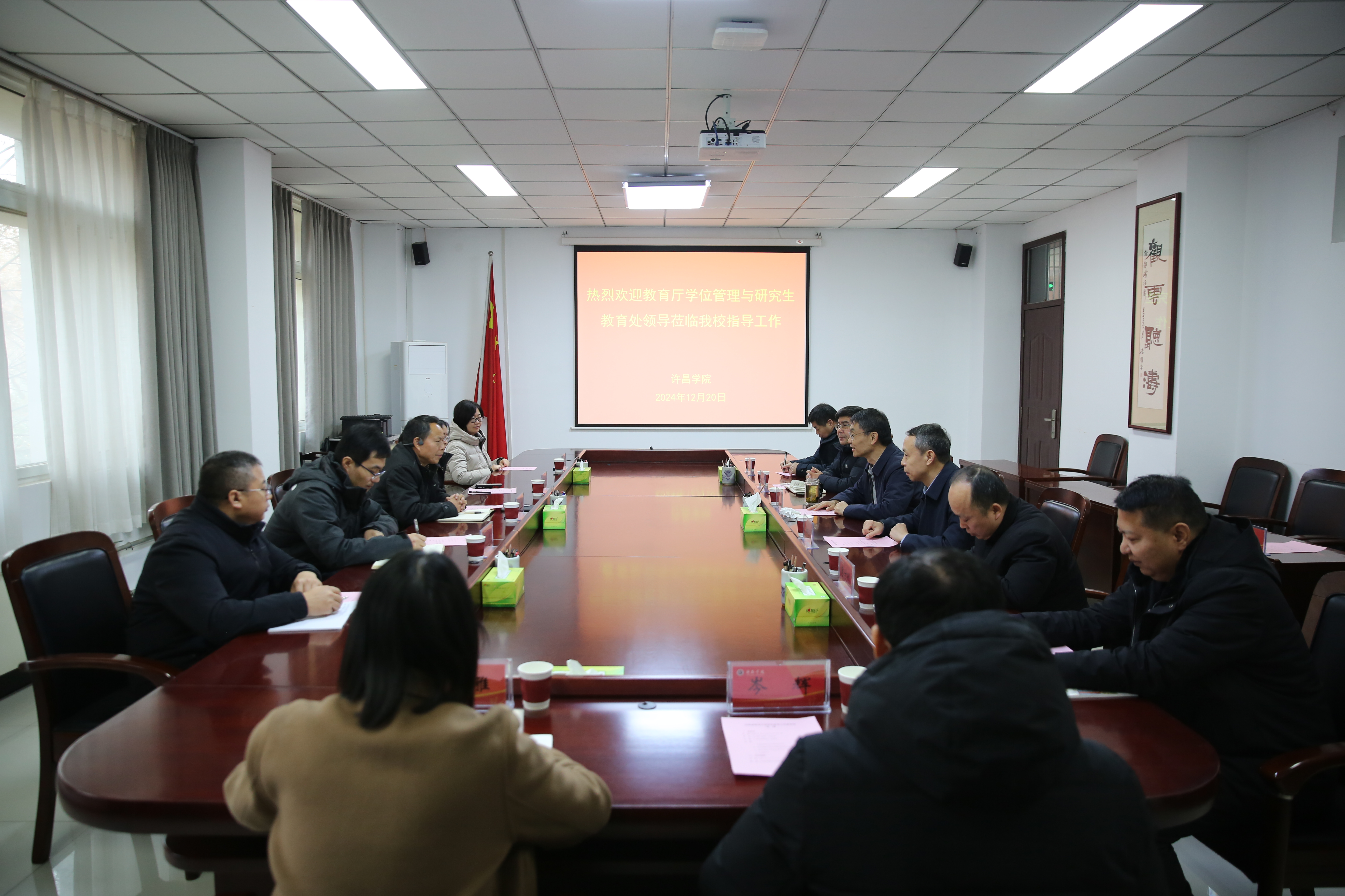 12月20日上午,河南省教育厅学位管理与研究生教育处处长岳德胜一行到威尼斯官网调研。校党委书记郭涛热情接待岳德胜一行。威尼斯官网在办公楼第一会议室举行座谈会,校长郑直、副校长杜根远出席座谈会。学科建设办公室及材料与化工、电子信息、食品与营养三个硕士点培育学科的相关负责人参加了座谈会。座谈会由杜根远主持。