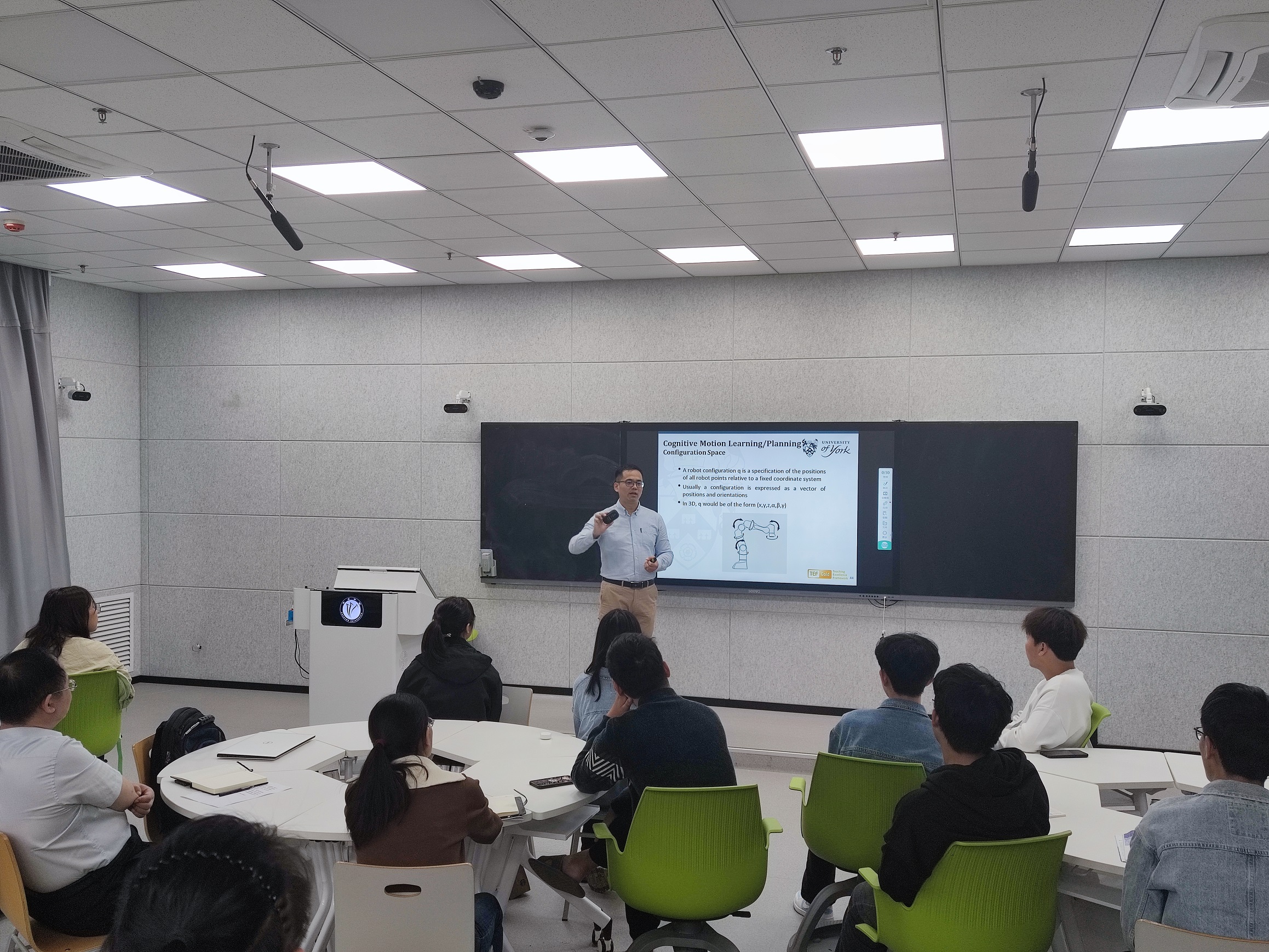 报告会上,刘鹏程简单介绍了约克大学计算机学院的相关情况,深入讲解了机器人和人工智能领域中自驱动仿生软机器人的构建、机器人的认知运动学习和运动规划等问题,通过动画生动形象的展示了研究成果在智能制造、智慧农业、智慧医疗等领域的应用情况,并就光线变化环境下的运动规划、机器人运动中的安全性以及仿生软机器人的构建等问题与参会师生进行了深入讨论。(图片由信息工程学院提供)