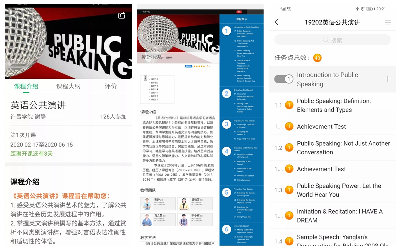 谢静老师介绍,本学期学生将通过“中国大学慕课”和“超星学习通”两个线上教学平台展开学习。她为学生编制了《英语公共演讲》学习指南,提前发布“教学微视频”“单元测验”和“课程讨论”,指导学生了解学习方法,掌握学习流程。学生通过观看教学视频、完成单元测验,获得此平台的学习成绩。“超星学习通”平台主要用于记录和检测学生“线下”学习情况,包含课堂签到、发布和批阅演讲实训作业、记录学生课堂参与度与综合表现。